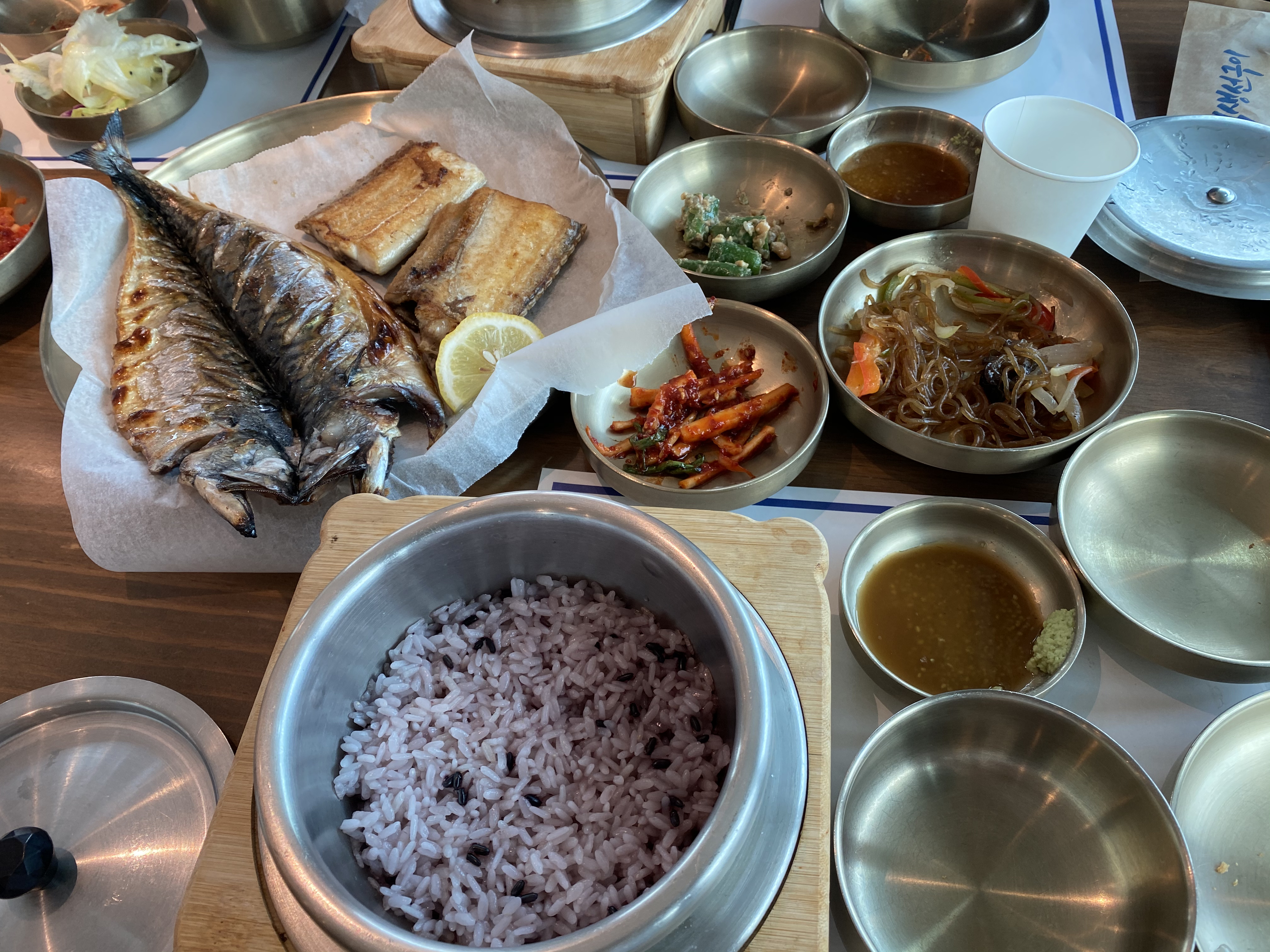 화로에 구워서 겉바속촉이며 생선구이만 먹으면 느끼할 수 있어서 조림을 같이 먹는 걸 추천한다